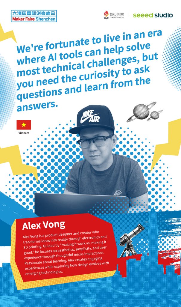 Alex excels at solving technical challenges with AI, bringing his visions to life through electronics and 3D printing. By bridging aesthetics with user experience, his projects have garnered significant international attention. If you’re interested in smart interactive toys, you should definitely come meet Alex in person!