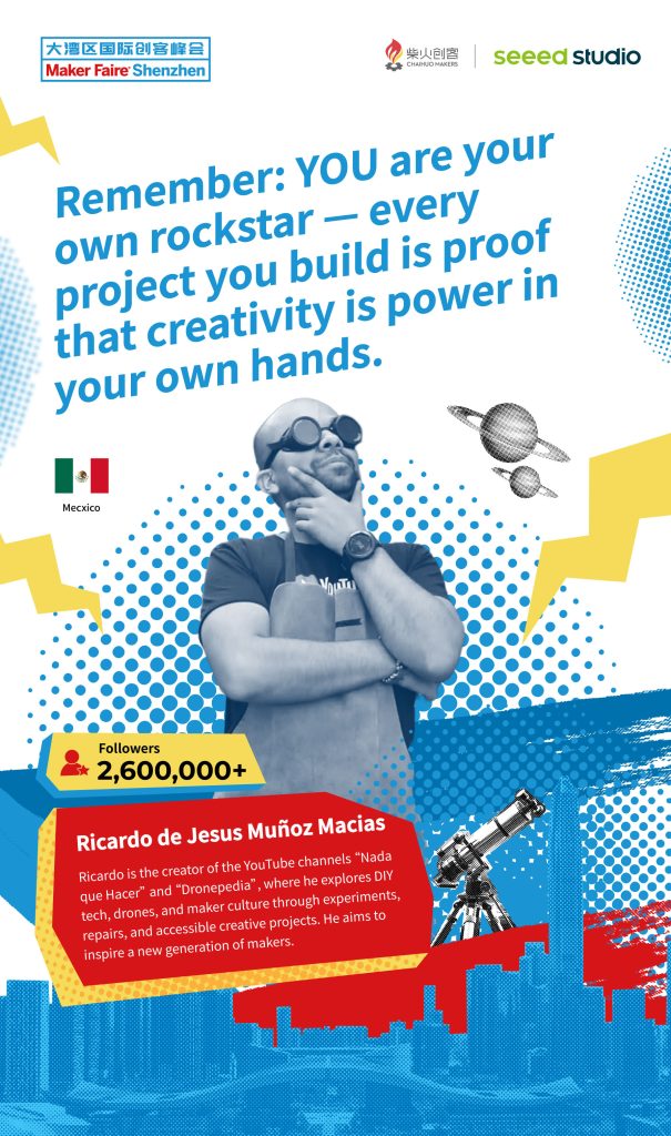 As a high-energy maker, Ricardo runs two YouTube channels—“Nada que Hacer” and “Dronepedia”—boasting over 2.6 million subscribers. He is also the co-founder of Polimata Maker Space, where he leads others in exploring DIY tech, drones, and maker culture through assembling, testing, building, and experimenting.